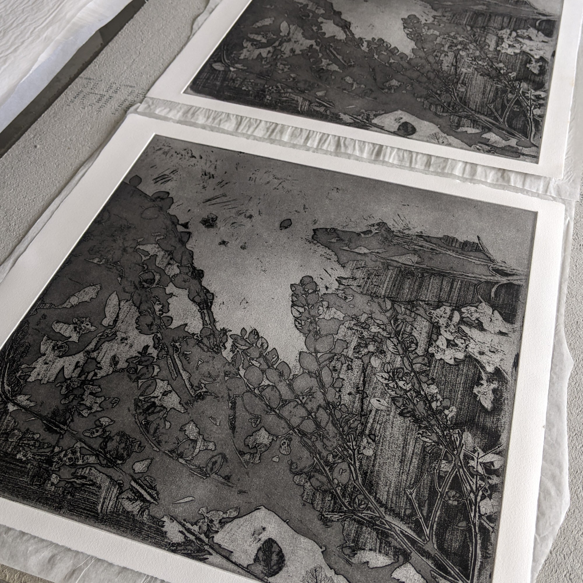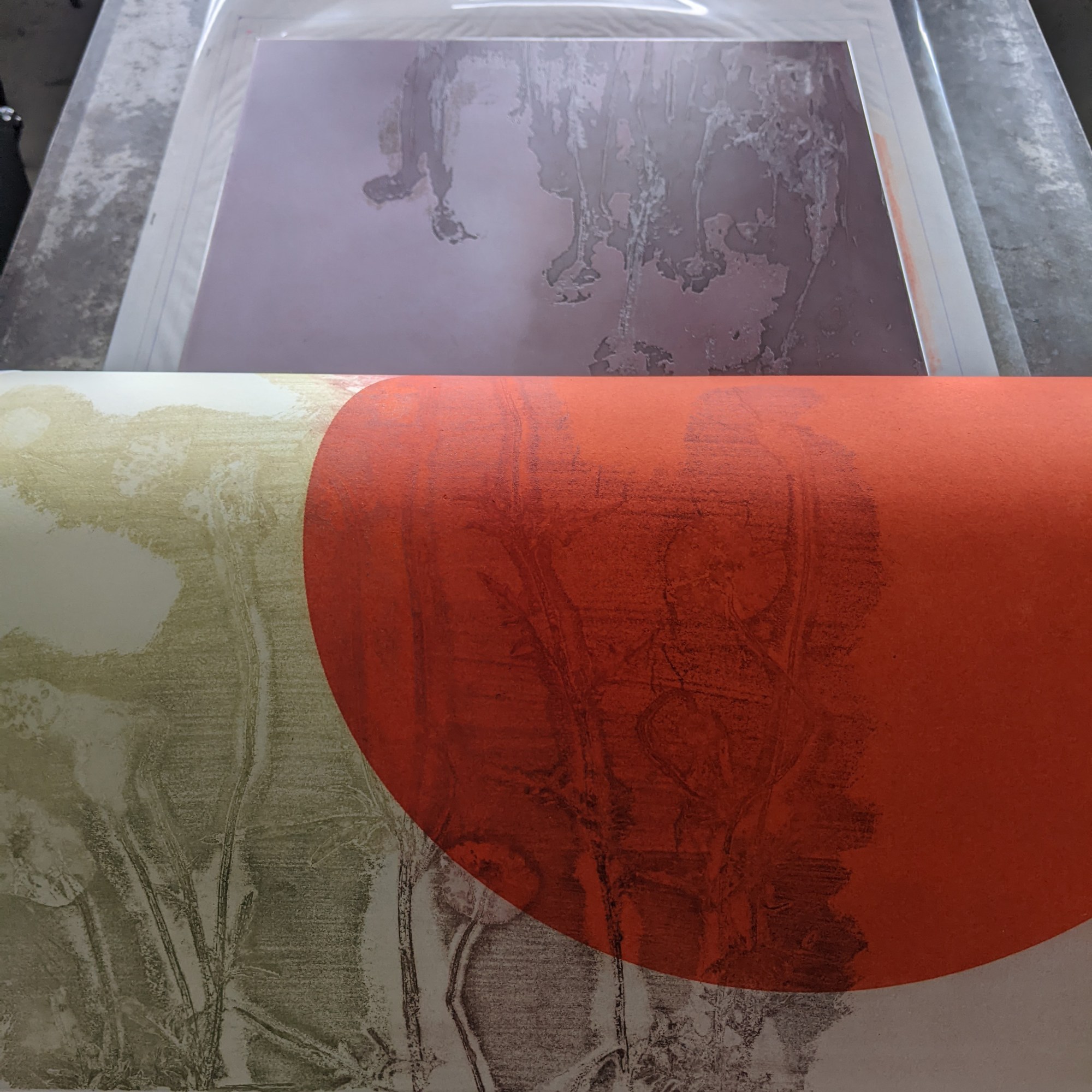 Plant debris collected from my daily commute along the river Thames to my studio, are etched deeply into mild steel, inked in bright colours, and layered on top of one another. Slightly apocalyptic, sometimes lyrical, occasional discordant, this body of work creates imagined landscapes of an uncertain future.