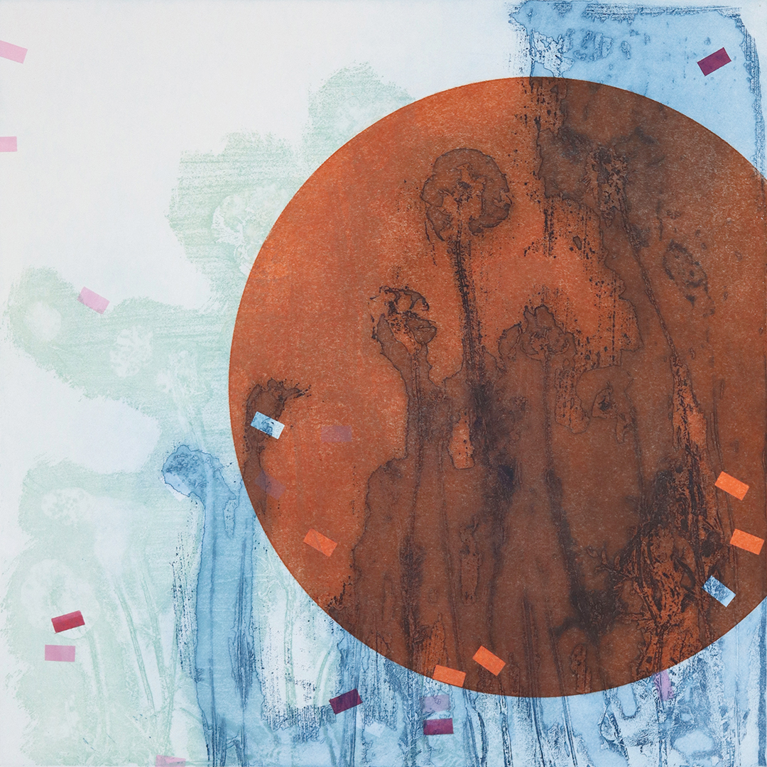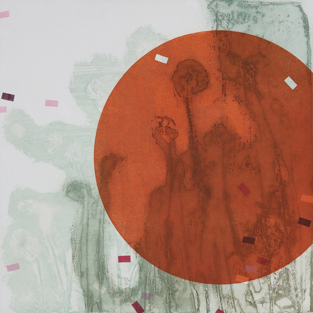 Unique, multiplate etchings, composed on the press from four plates: two deeply etched steel plates, one monoprint plate, one drypoint plate. Each time the improvisation is ‘played’, adjustments are made, subtle shifts in tone, or sweeping variations of colour.