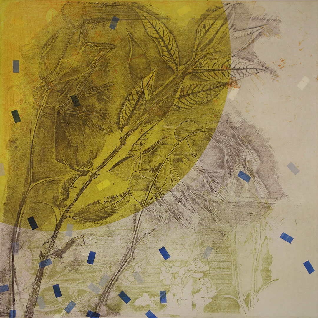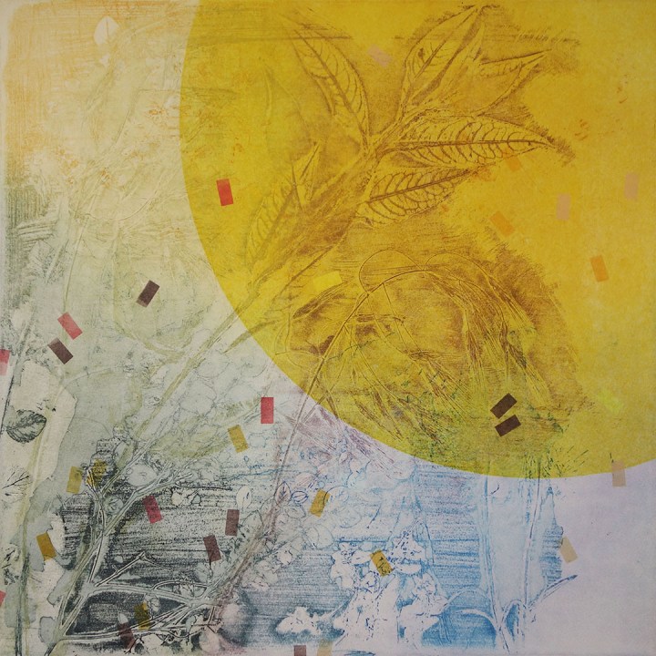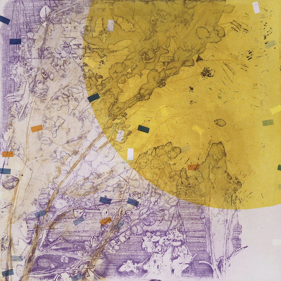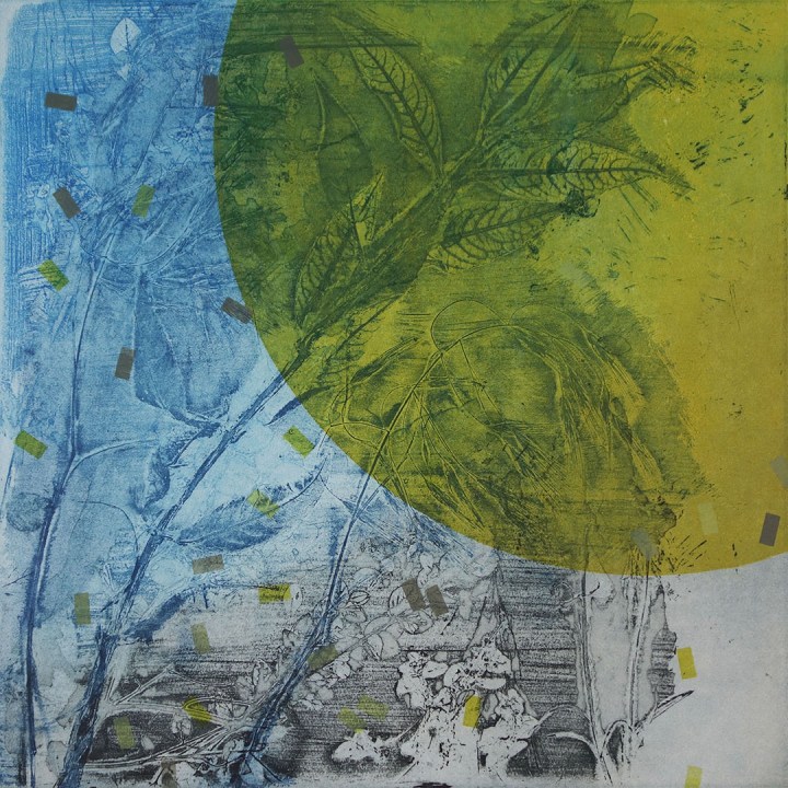 Unique, multiplate etchings, composed on the press from four plates: two deeply etched steel plates, one monoprint plate, one drypoint plate. Each time the improvisation is ‘played’, adjustments are made, subtle shifts in tone, or sweeping variations of colour.
