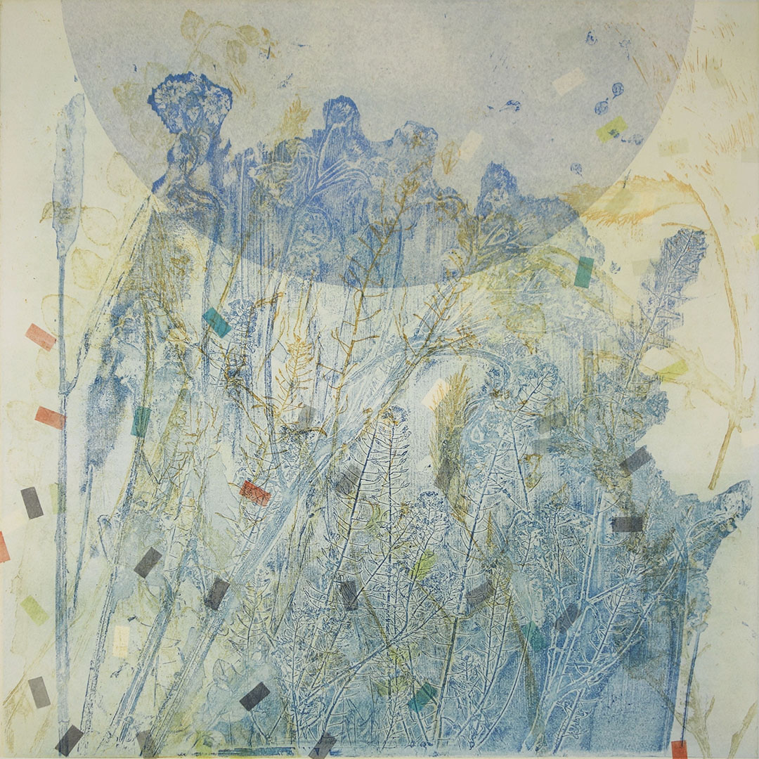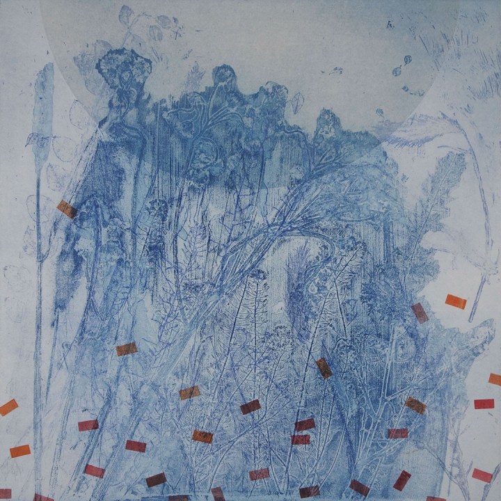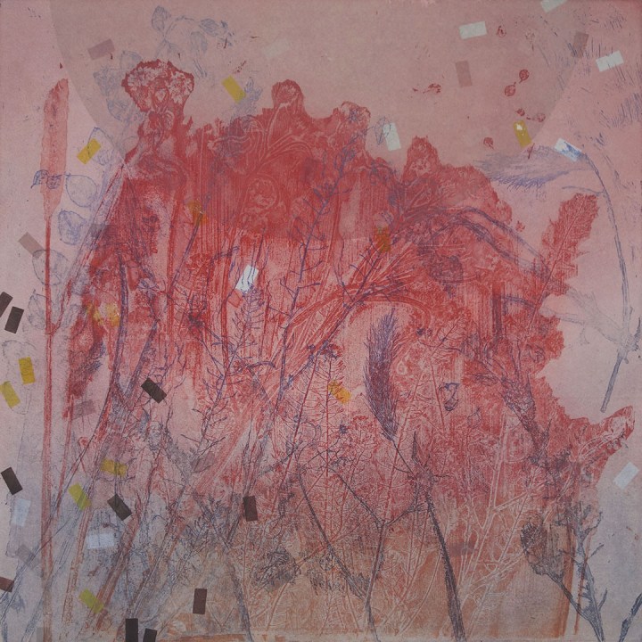 Unique, multiplate etchings, composed on the press from four plates: two deeply etched steel plates, one monoprint plate, one drypoint plate. Each time the improvisation is ‘played’, adjustments are made, subtle shifts in tone, or sweeping variations of colour.