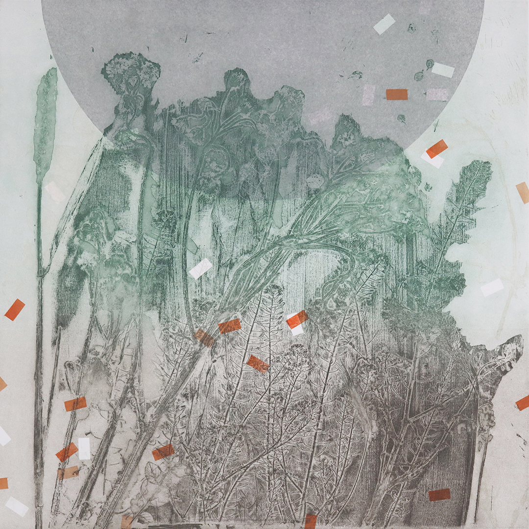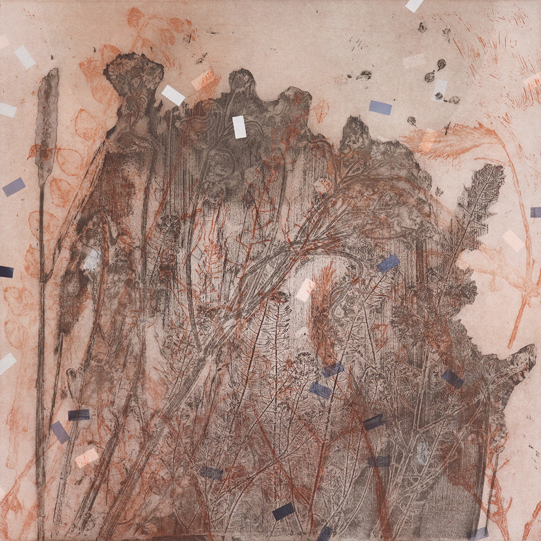 Printed from a library of steel plates made with lower toxicity, more sustainable methods and materials. Etched plates made from plant matter collected along the Thames Path in Woolwich Dockyard.