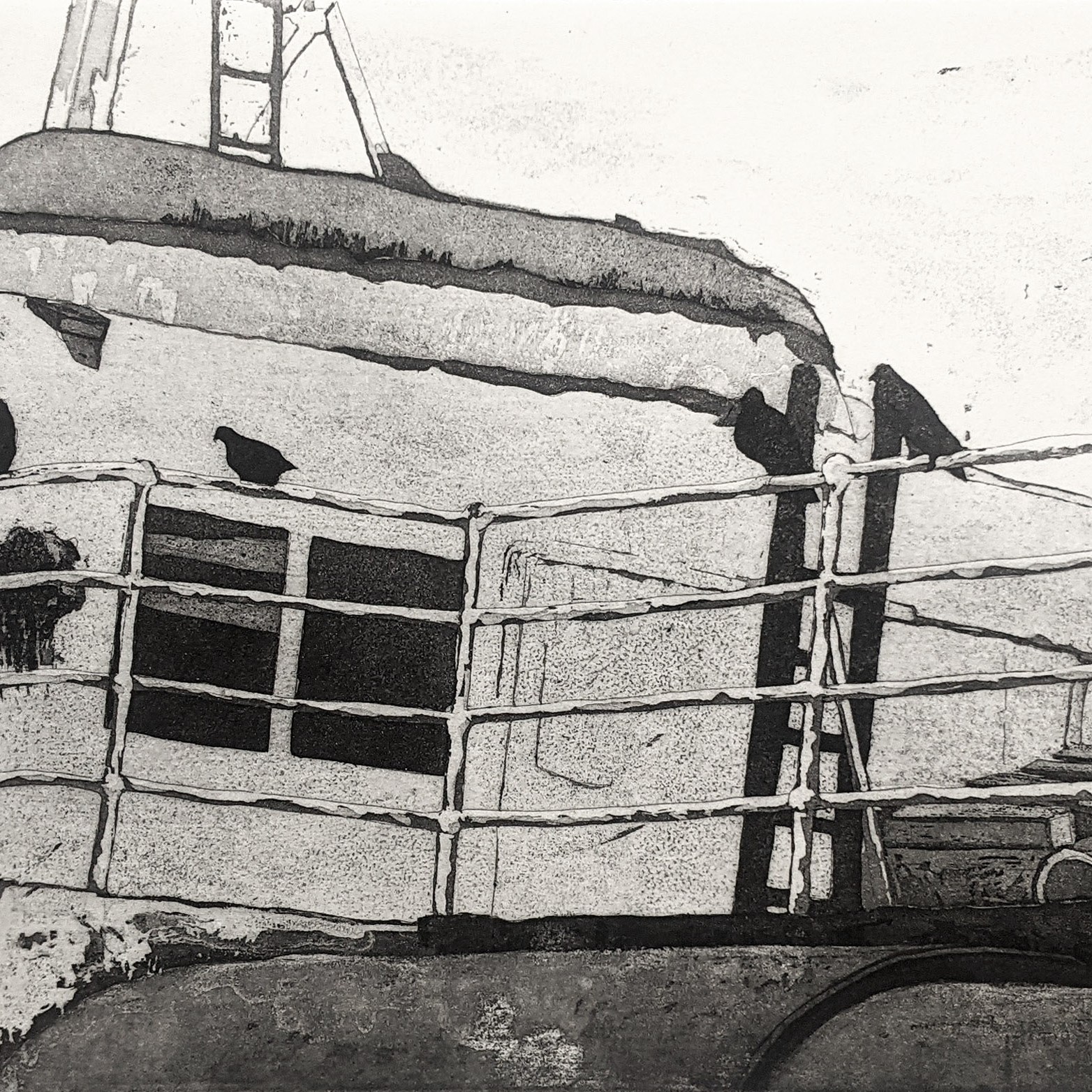 This body of work follows a colony of pigeons aboard the Royal Iris, a Mersey ferry now abandoned and moored by my studio in Woolwich. Pigeons are much maligned, despite being genetically identical to doves. This series prints draw parallels between ourselves and this community of migrants. These interlopers are studied in etchings and stone lithographs, techniques usually reserved for doves, swans and peacocks, examining our biases of these animals whose lives are so similar to our own.