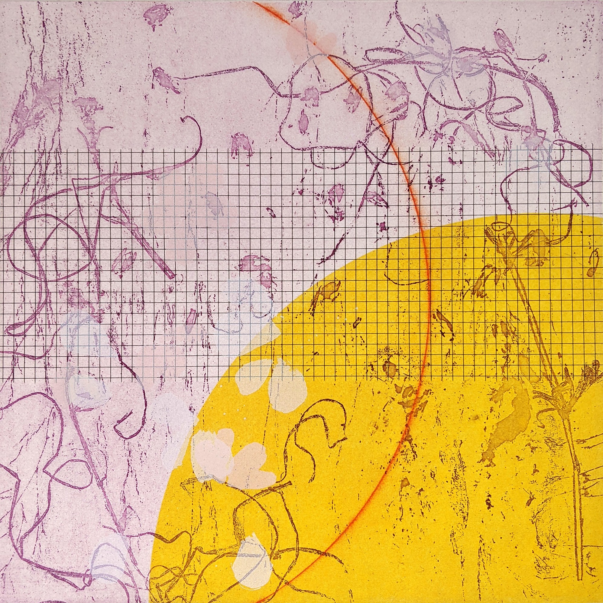 Studies are 18cm x 18cm, and produced in small editions; the number of prints I can achieve in a single day. Each study is a combination of four plates, made from a library of drypoint, enviromount, photopolymer and steel. Blossom petals are screenprinted overtop, lightly obscuring the deeply trodden debris.